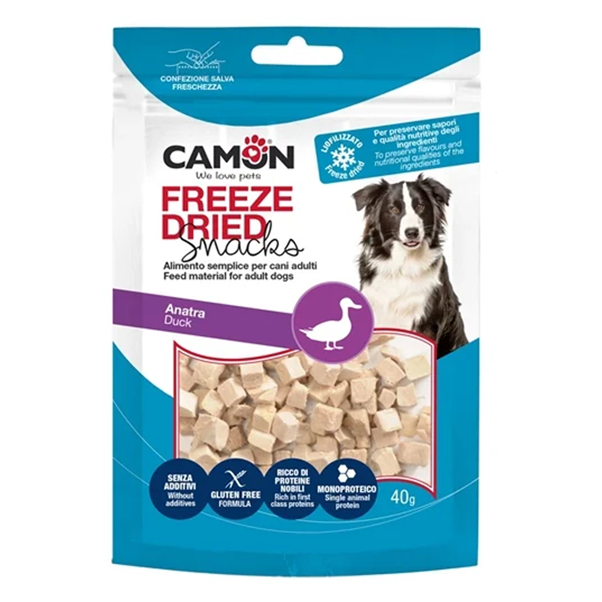 חטיף טבעי לכלבים, המיוצרים מנתחי ברווז המיובשים בהקפאה, שיטה המשמרת את הערכים התזונתיים, הטעם והמרקם, והופכת אותם לחטיפים קלים ואיכותיים לאילוף ולפינוק, ללא תוספים מלאכותיים, ומתאימים גם לכלבים עם רגישויות.