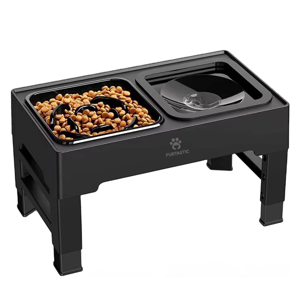 מתקן מתכוונן משולב קערת מים למניעת התזה וקערת האכלה איטית המסייעת בהאטת קצב האכילה של